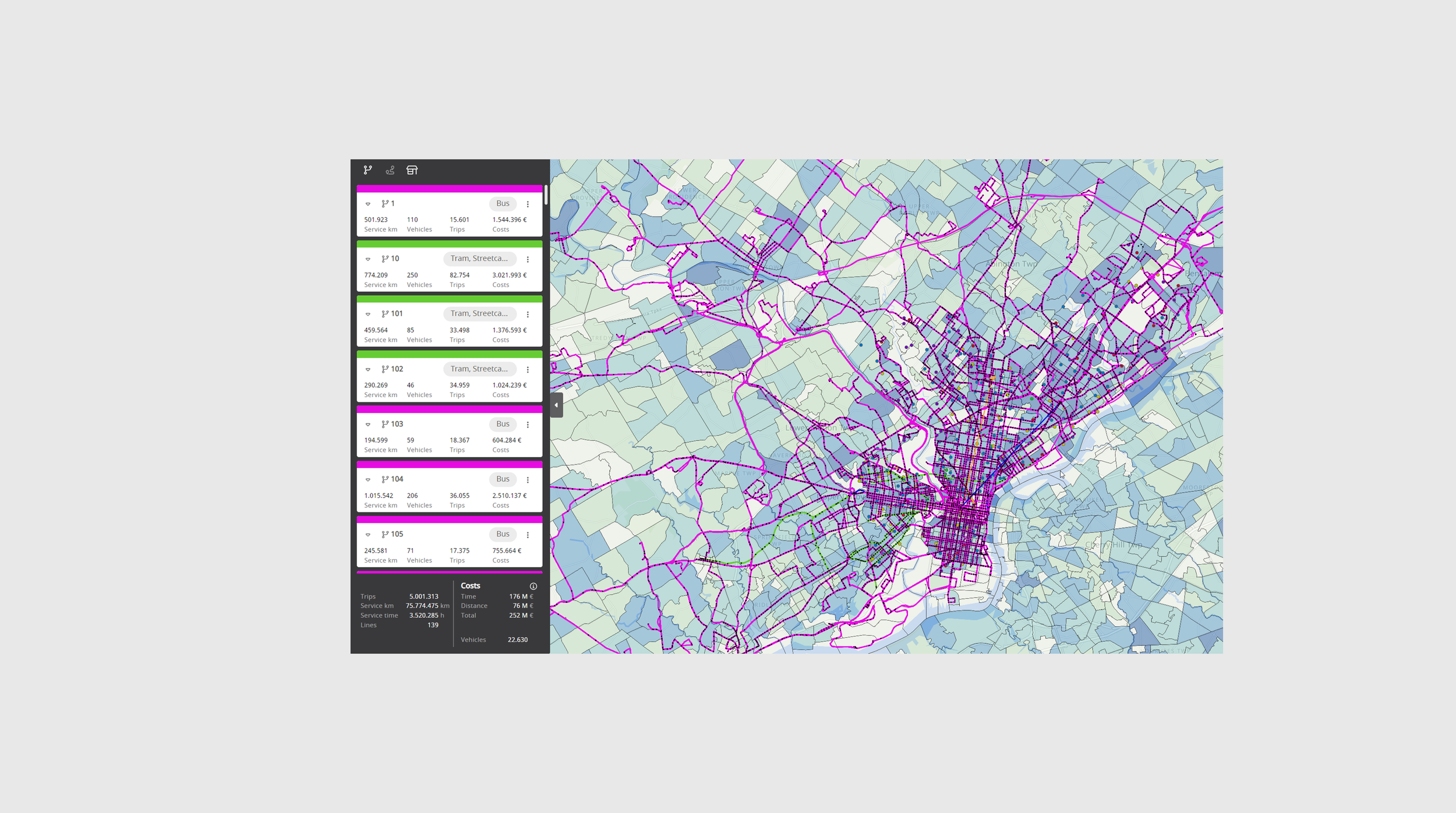I dati delle matrici O-D potranno essere utilizzati con piattaforme di pianificazione avanzata come PTV-Lines dotate di strumenti di simulazione e assegnazione. Con questo strumento, di facile utilizzo, sarà possibile confrontare più versioni di servizi, apportando in modo agevole variazioni su percorsi e orari, e avere un feed-back immediato sulle performance delle modifiche.